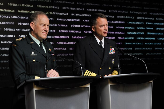 Ottawa Ontario Canada - PETERSON AIR FORCE BASE, Colo. - Admiral James Winnefeld and General Walt Natynczyk speak to the media during the Media event in conference room D at the National Defence Headquarters in Ottawa. (Canadian Forces Support Unit (Ottawa) Photo Services by Private Mathieu St-Amour)